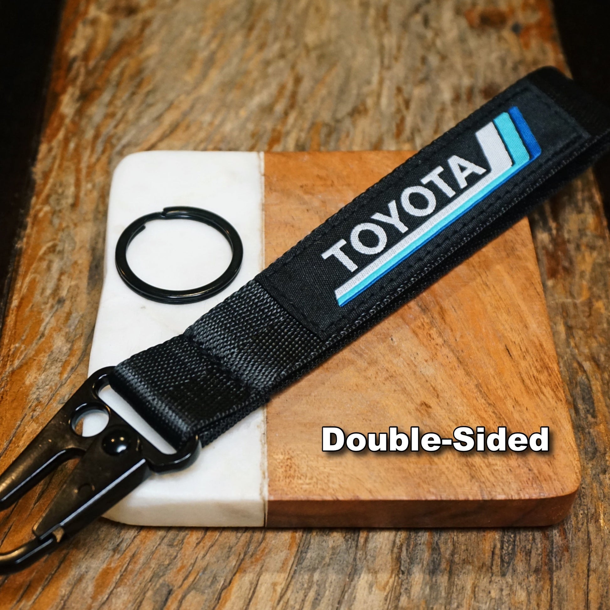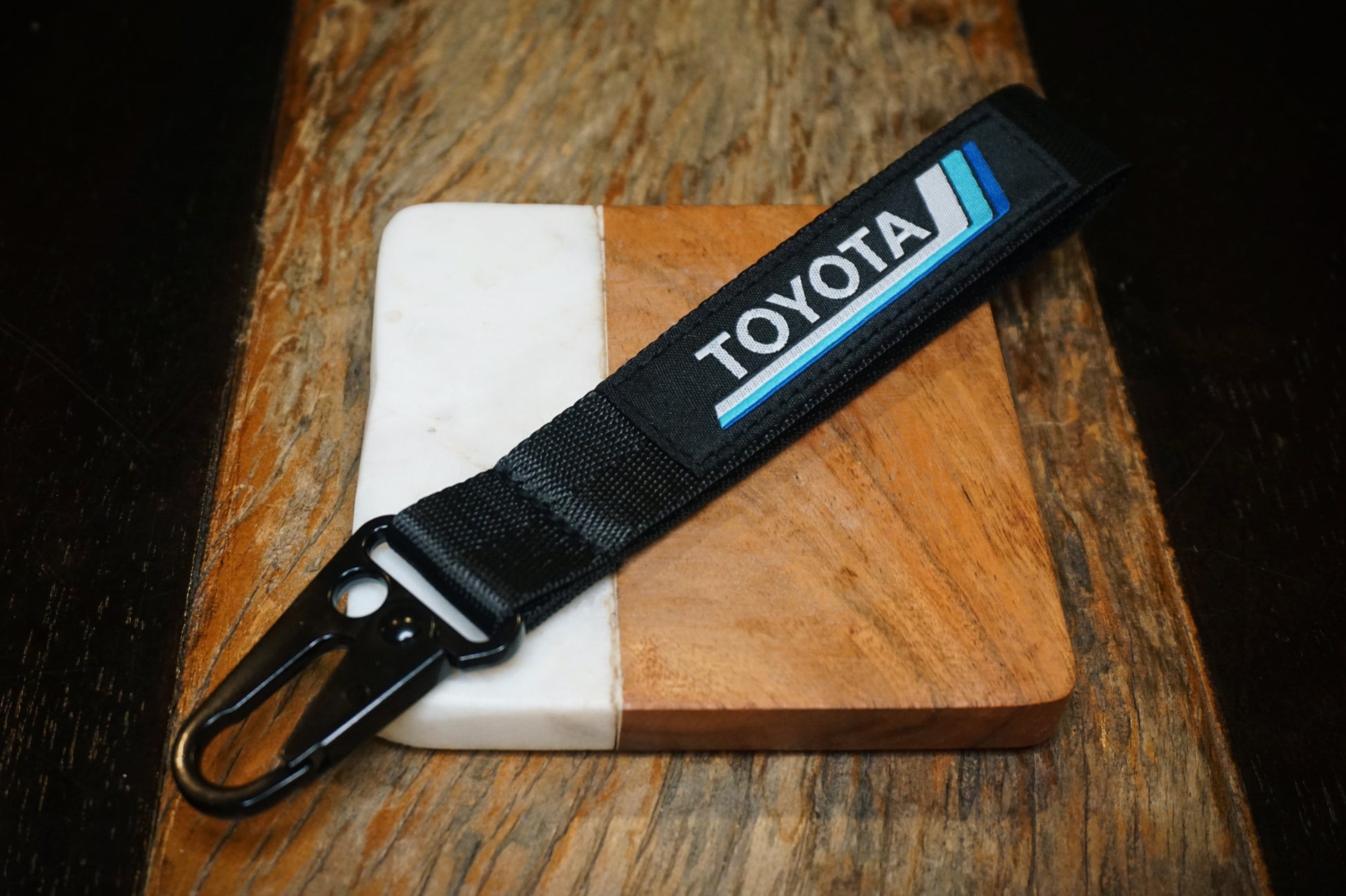 Blue Theme Vintage Style Heritage Stripes Keychain Lanyard for Toyota. Tri-Color design in White, Light Blue, Blue stripes. High quality, durable, nylon strap metal clip-on accessory. Key Ring is Included.