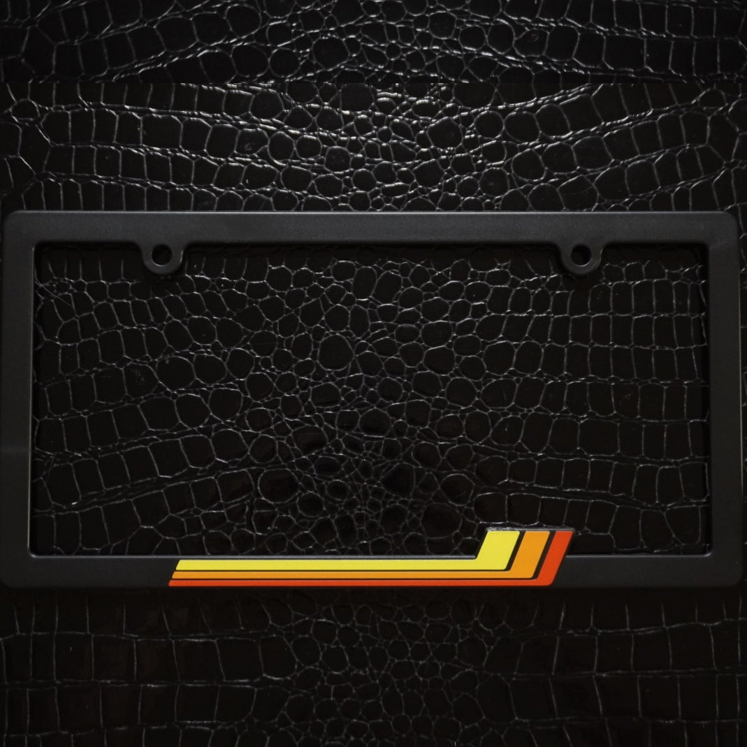 Vintage Heritage Stripes license plate frame for Toyota. Matte black plate finish. Available in multiple TRD style color schemes. Fits all standard 6 inch by 12 inch license plates. Retro style, classic Toyota Heritage appreciation.