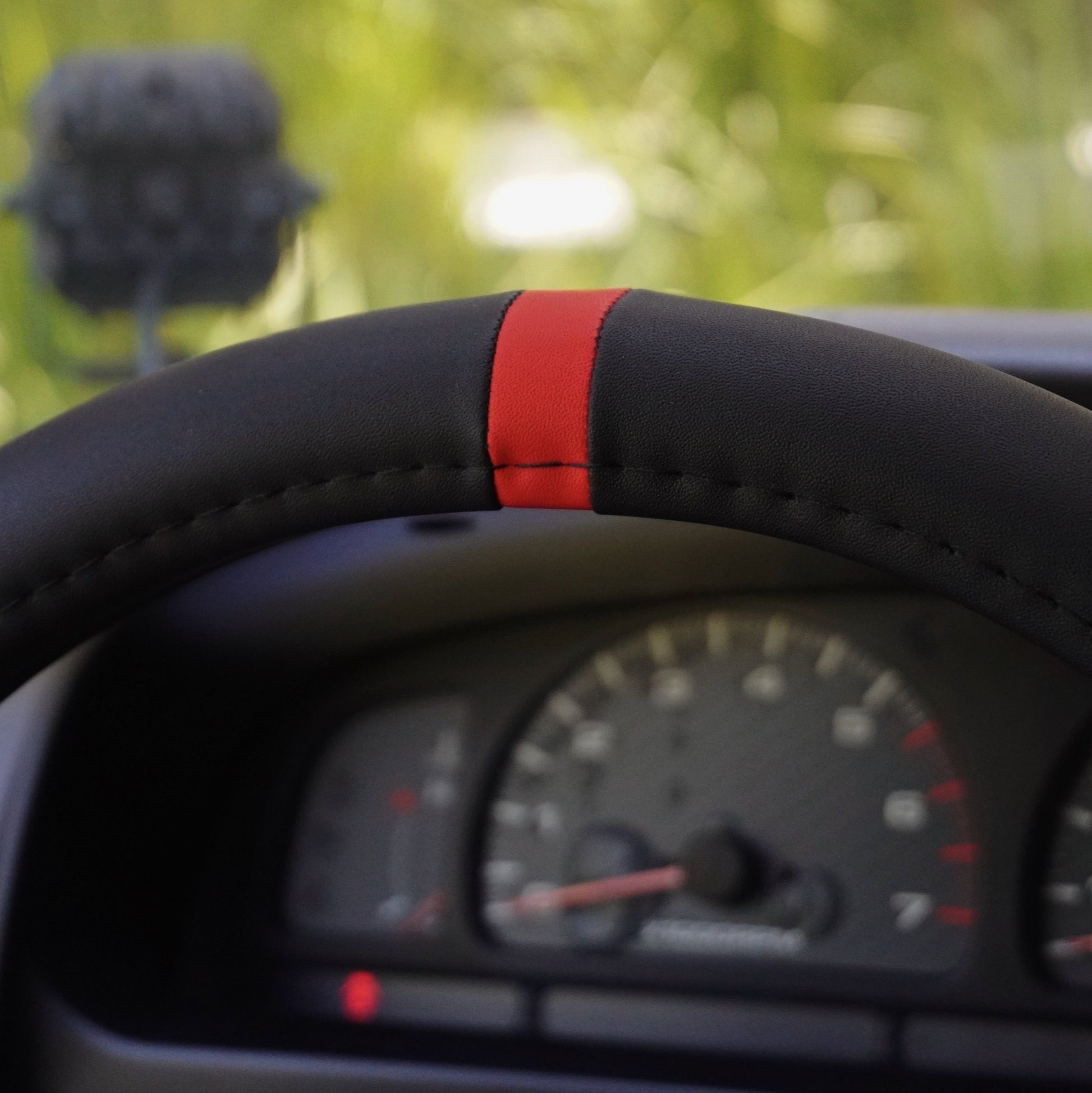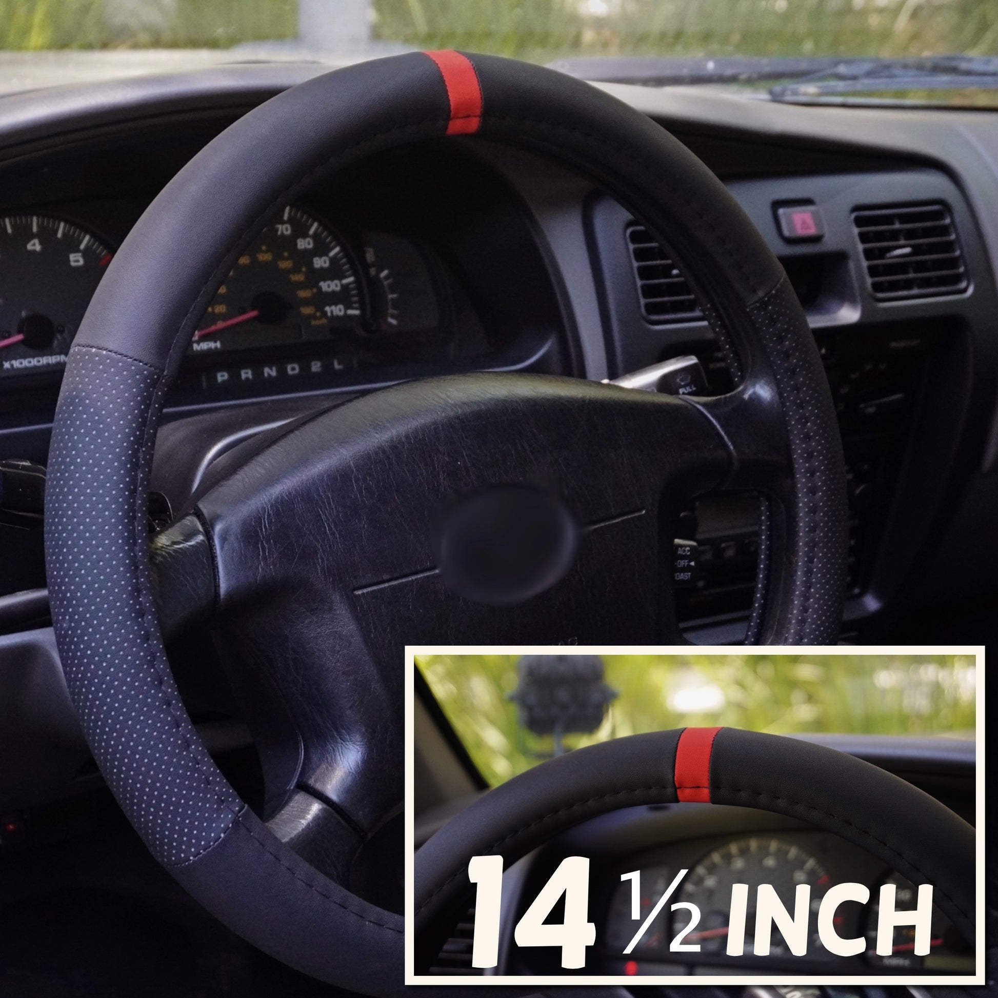 Give your car aggressive styling and protection with our custom made red racing stripe steering wheel cover in 14.5 inch/36.83 cm fitment. Universal fitment for round style steering wheels, not designed for flat bottom wheels. Perforated Leather styling located on each side of the cover for a classy, sporty look and comfortable feel. Please measure your wheel diameter and reference our Fitment Guide image before purchasing.