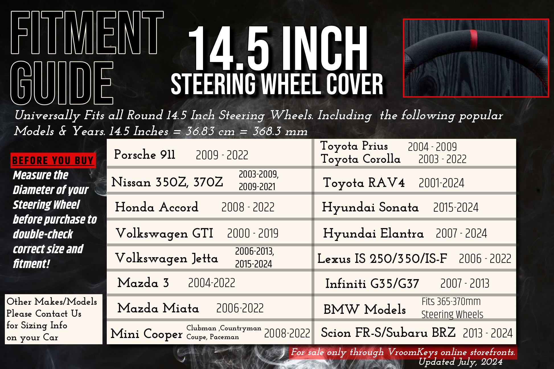 Fitment Info: Properly sized steering wheel covers should fit very snug to your existing OEM original steering wheel. Our fitment guide references factory OEM steering wheel sizes for some makes and models, but best practice is to measure your wheel and research your steering wheel size before purchase to ensure correct fitment. Contact us if you need help choosing a size for your car, truck, or SUV.