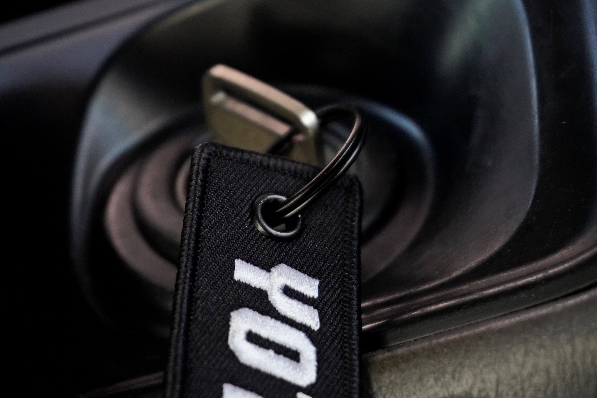 Blue Scheme Retro Stripes TRD style keychain tag in Black fabric with Black Key Ring, Embroidered. Blue scheme White, Light Blue, Blue stripes. Crafted for TOYOTA Owners & Enthusiasts